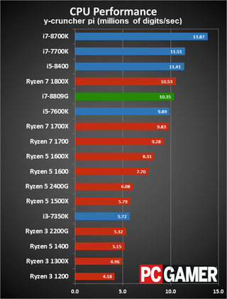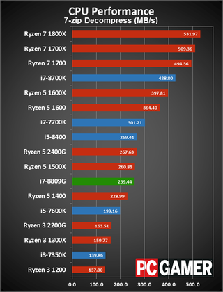 Passant des tâches de jeu et de graphisme aux tâches de calcul traditionnelles, Kaby Lake-G ressemble exactement à Kaby Lake. Il s’agit d’une partie à 4 cœurs / 8 threads cadencée à 4,2 GHz et, plus important encore, elle peut supporter des horloges turbo toutes cœurs de 3,9 GHz. Cela le rend un peu plus lent que le i7-7700K, mais plus rapide qu'un i5-7600K. Voici les repères.