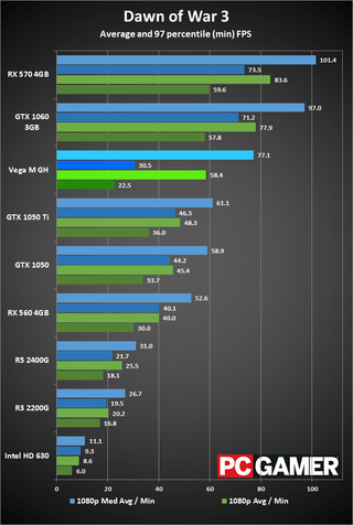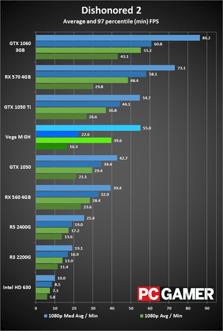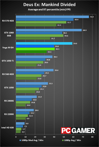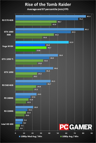 Qu'en est-il par rapport aux cartes graphiques de bureau? Ici, les performances sont bonnes, même si vous n’allez pas remplacer un GPU médium ou supérieur dédié pour le moment. Le Vega M est dans la plupart des cas plus rapide que la GTX 1050 Ti et devance nettement les GTX 1050 et RX 560, mais il est bien inférieur aux GTX 1060 3 Go et RX 570 4 Go. C’est ce à quoi on s’attend, car le 570 a plus d’unités de calcul (32 par rapport à 24) et est cadencé plus haut, mais cela montre que la bande passante de la mémoire ne freine probablement pas le Vega M. De toute façon, c’est impressionnant de voir une solution graphique intégrée fonctionner mieux que plusieurs GPU de bureau dédiés de la même génération.