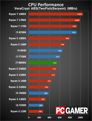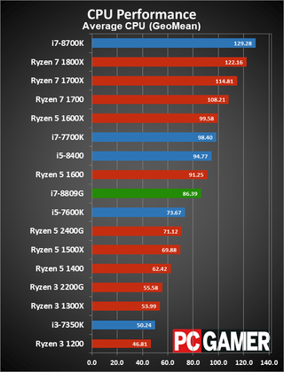 En termes de performances globales du processeur, le i7-8809G se situe juste derrière le Ryzen 5 1600 et un peu plus loin du rythme des i5-8400 et i7-7700K. Les performances mono-thread sont toujours bonnes, tandis que les charges de travail fortement threadées favorisent les composants à 6 et 8 coeurs. La plupart des utilisateurs exécutent rarement des tâches qui bénéficient de cœurs et de threads supplémentaires, et le système i7-8809G s'avère tout à fait capable en tant que solution efficace. Cela signifie également que toute tâche moins intensive, y compris le streaming vidéo et l'édition de photos, se déroulera correctement sur la puce.